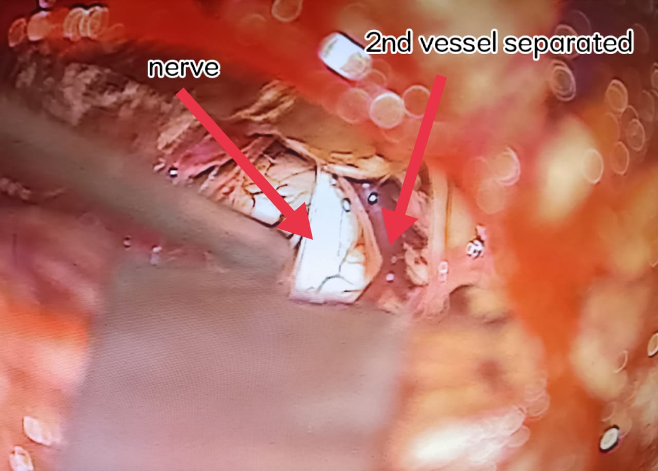 42 yrs female presented with a history of right side facial pain for 6 yrs. on examination was diagnosed with trigiminal neuralgia ( pain because of trigiminal nerve getting irritated by blood vessels). MRI showed blood vessels irritating the nerve. she was on 6 different painkillers for the last 3 years but still, she had severe facial pain. 2 days back underwent surgery. Blood vessels irritating the nerve were separated from the nerve and a Teflon patch was inserted between them. The next-Day patient was pain-free without any painkillers.