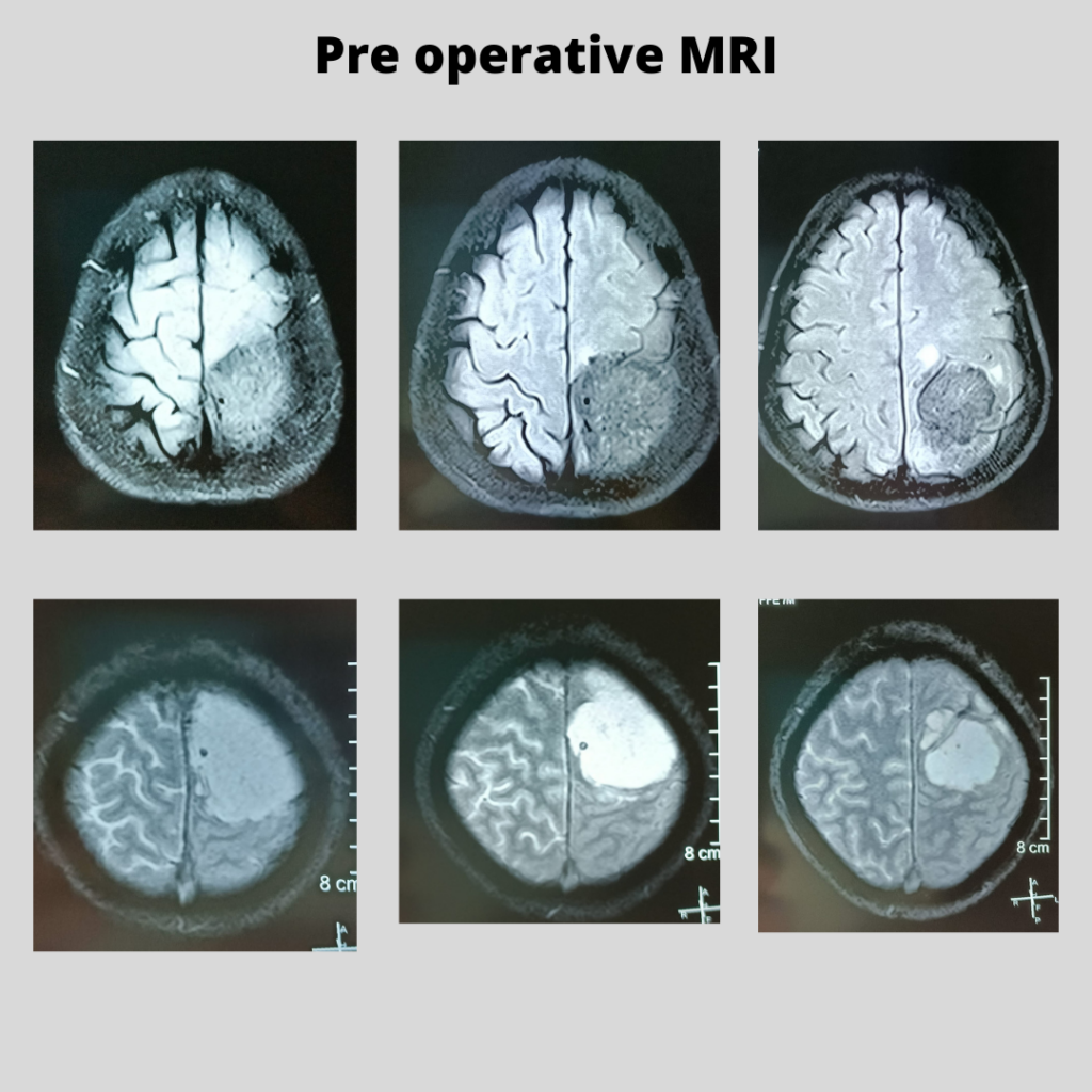 MRI showed a tumor on the left side of the brain with multiple blood vessels crossing through the tumor.