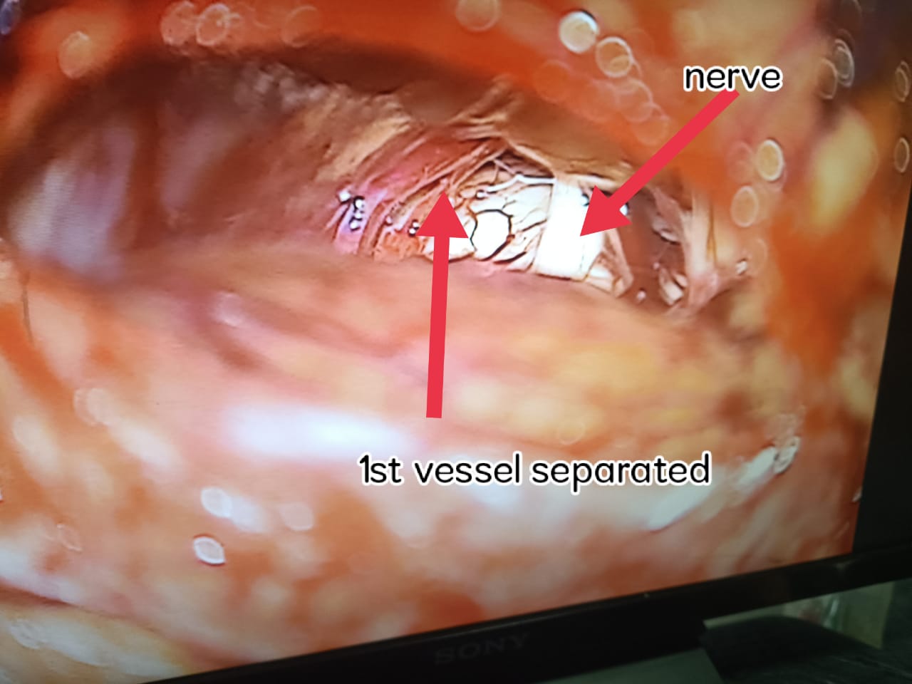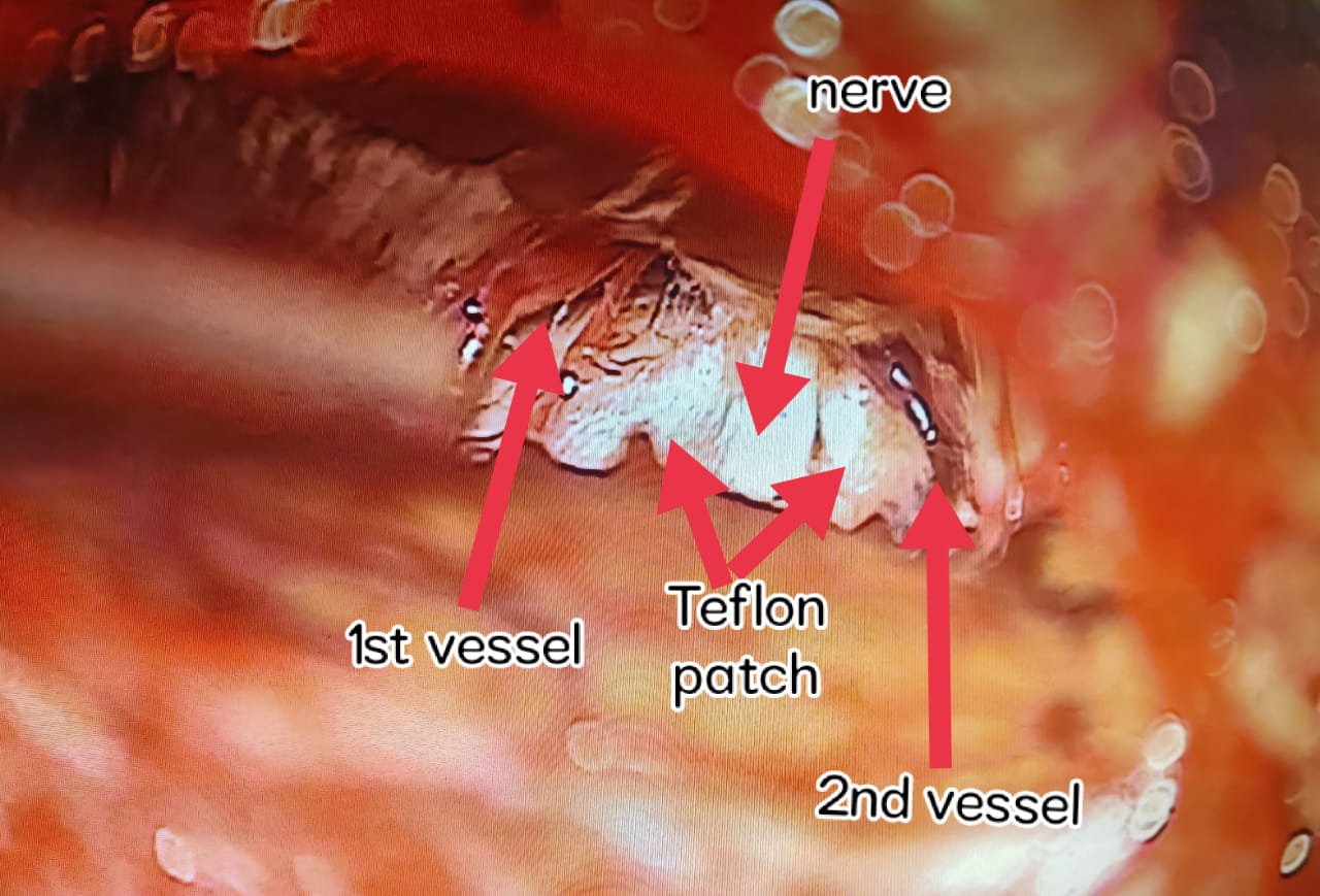 42 yrs female presented with a history of right side facial pain for 6 yrs. on examination was diagnosed with trigiminal neuralgia ( pain because of trigiminal nerve getting irritated by blood vessels). MRI showed blood vessels irritating the nerve. she was on 6 different painkillers for the last 3 years but still, she had severe facial pain. 2 days back underwent surgery. Blood vessels irritating the nerve were separated from the nerve and a Teflon patch was inserted between them. The next-Day patient was pain-free without any painkillers.